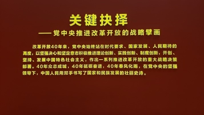該展覽通過關(guān)鍵抉擇、壯美篇章、歷史巨變、大國氣象、面向未來等主題展區(qū),運(yùn)用歷史圖片、文字視頻、實(shí)物場(chǎng)景、沙盤模型相結(jié)合的手段,展示了改革開放40年來我國的偉大變遷。